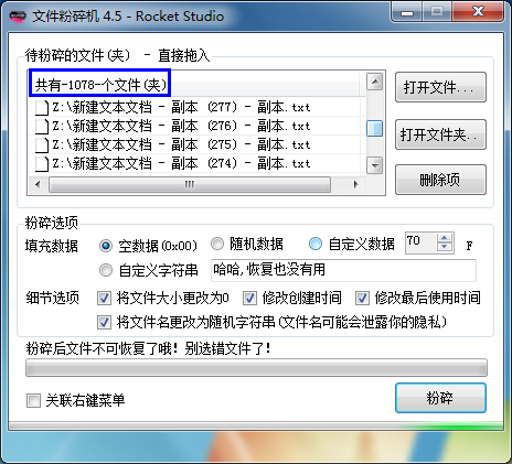 >>>使用指定方法粉碎文件并删除 string filename : 文件名 ShredMode sm : 粉碎的方法(填充数据的类型)(RandData随机数, UserByte指定的字节, UserString指定的字符串) Object data : 填充的数据(根据ShredMode指定的方法拆箱)可以为string,byte,在ShredMode为RandData时可以为null bool IsCleanCreatedDate : 是否更改创建日期(指定为2012,12,24) bool IsCleanLastUsedDate : 是否更改最后使用日期(同上)