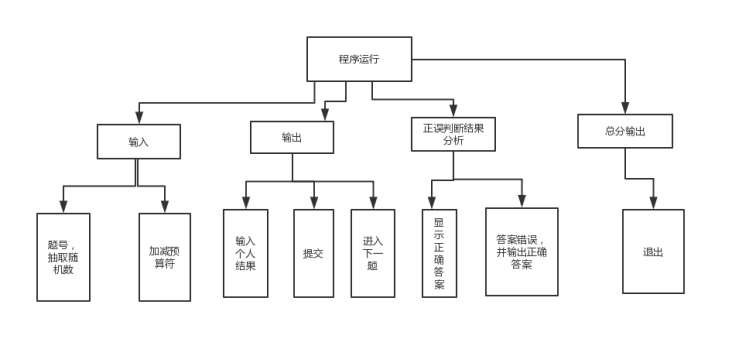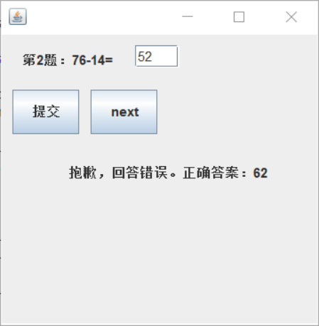 功能描述:1、当进入“运损测试程序”界面是,根据计算机随机得出的题目,在输入框中输入运算结果。选择“提交”按钮将看到运算出错。正确时界面框中,输出“恭喜,回答正确”。并自行加分。错误时界面框中,输出“抱歉,回答错误”和正确答案。