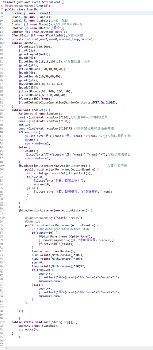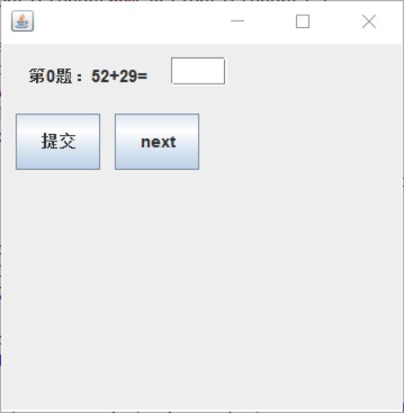 利用JFrame窗口和JPanel容器函数进行主界面的输出,分别对窗口的大小,窗口内的标题框,答案框,和其中的输出都进行大小的设置,导入Java程序的包,从0-99中抽取两个数进行加减法运算,然后判断正误和运行次数然后输出总分 可以调用Math.random()*100抽取100以内的随机数 答对的就自行加分答错不加分并打出正确的答案,当数组一个一个读出来再排序读出