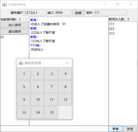 综合应用Java的GUI编程和网络编程,实现一个能够支持多组用户同时使用的聊天室软件。该聊天室共分为客户端和服务器端两部分,服务器端程序主要负责侦听客户端发来的消息,客户端需要登录到服务端才可以实现正常的聊天功能。服务器端的主要实现在特定端口上进行侦听,等待客户端连接,默认端口设置为9999。客户端的主要功能为,连接到已经开启服务的服务端。具有比较友好的GUI界面,并使用C/S模式,支持多个用户同时使用,用户可以自己选择加入或者创建房间,和房间内的其他用户互发信息,互发表情。