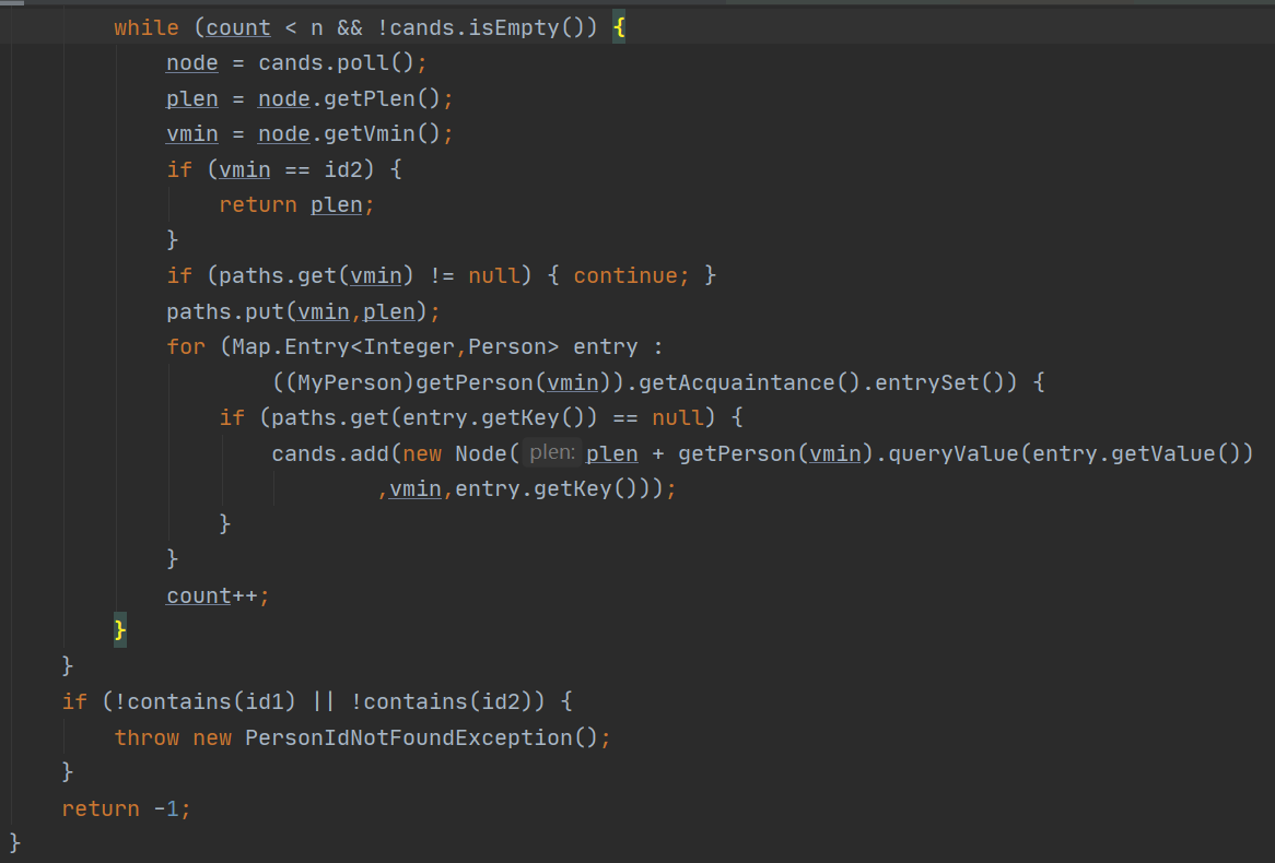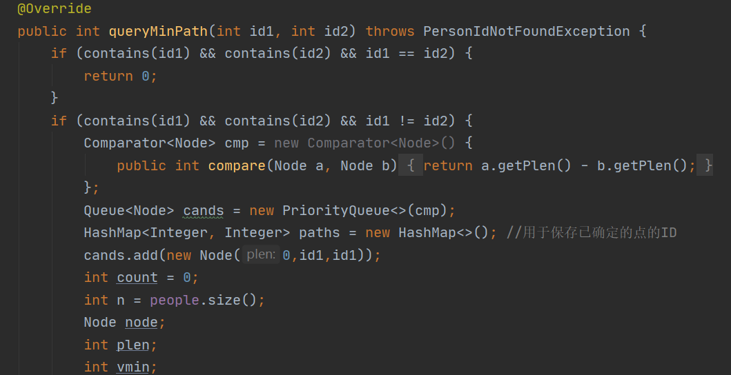 第三次作业是本单元的大头,也是最能展现本质的一次,这次作业新增了求最短路径,求连通分量,以及查看两点之间有没有割点的要求,这些都是图论的经典问题,对我们的数据结构和离散数学的知识提出了较高的要求。虽说我们对各种算法都有了解,但是真正写起算法时发现还是有点难度,因为我们作业的情况有时候不需要实现模板算法一样具用强大功能的算法,所以我很大程度上都是自己写的,主要采用了bfs进行查找,另外新增了一个Node类来作为节点,在用优先队列找最短路径的时候使用。