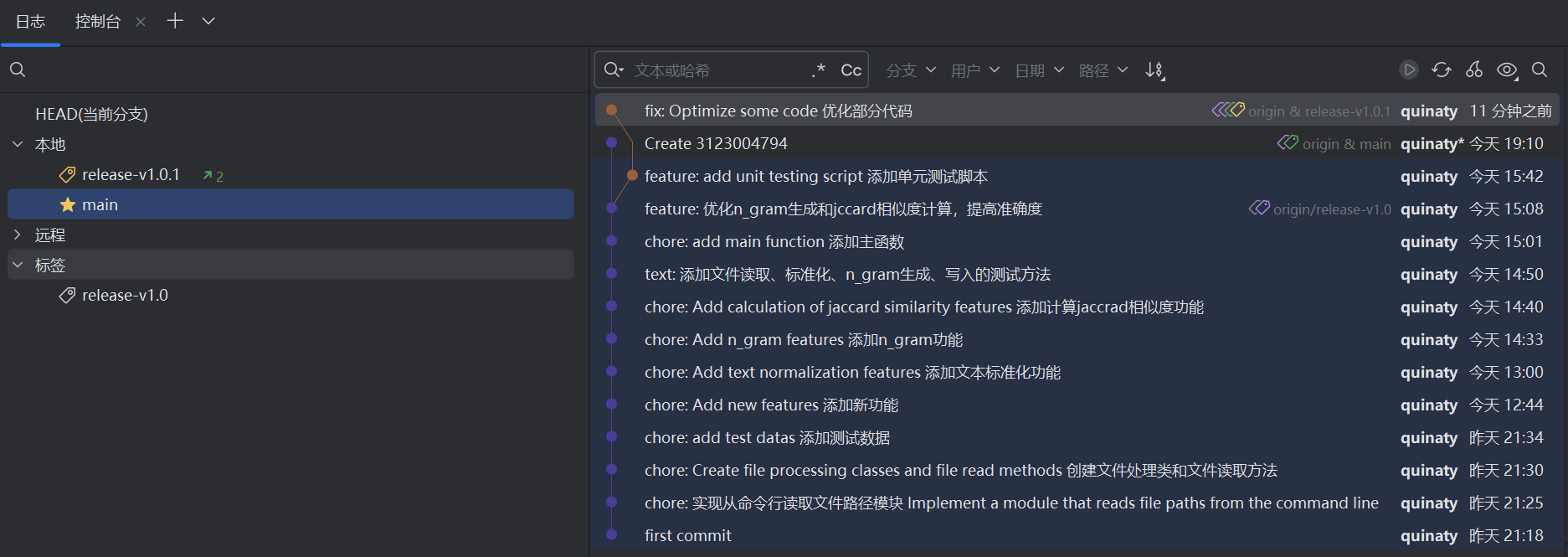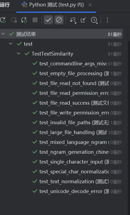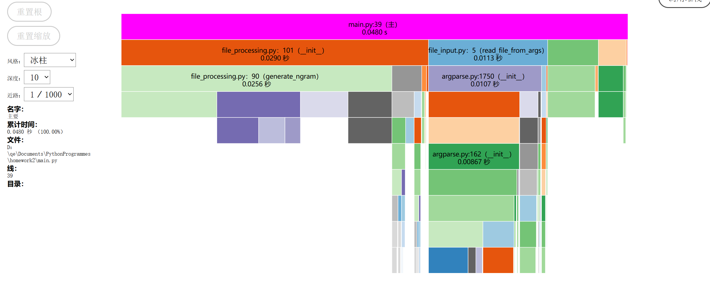 file_processing.py中进行的文本标准化,分词,n-gram生成等操作涉及到大量循环调用与文件读写,占用CPU最多,时间开销最大- 使用混合n-gram策略,在计算jccard相似度时涉及较多的浮点计算,计算时间较长
