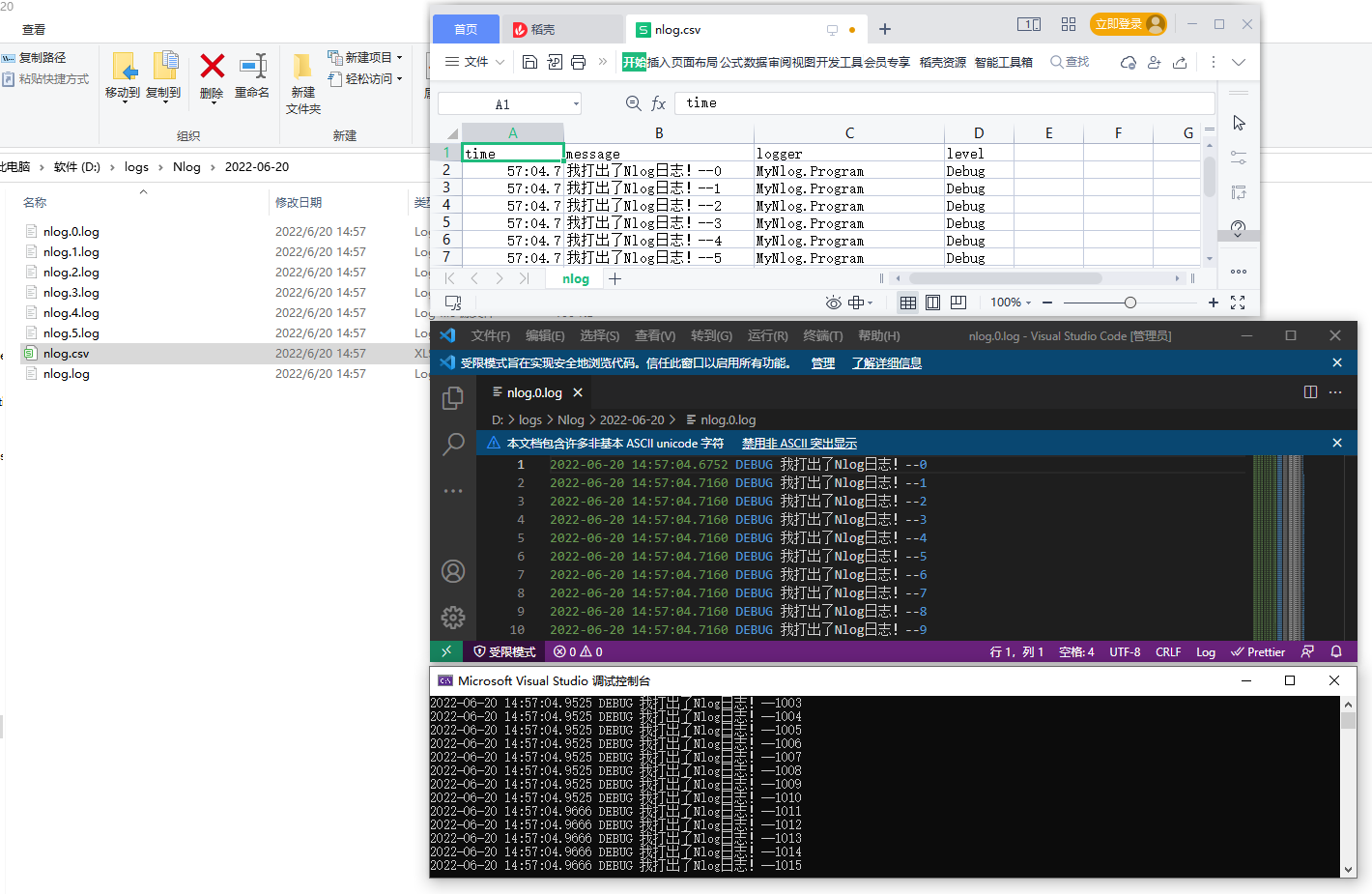 Logger Logger = NLog.LogManager.GetCurrentClassLogger(); for (int i = 0; i < 10_000; i++) { Logger.Debug($"我打出了Nlog日志!--{i.ToString()}"); }