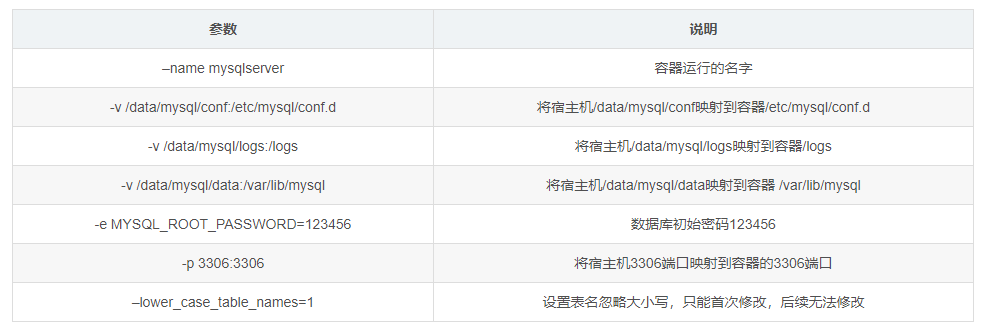 docker run --name mysqlserver -v /data/mysql/conf:/etc/mysql/conf.d -v /data/mysql/logs:/logs -v /data/mysql/data:/var/lib/mysql -e MYSQL_ROOT_PASSWORD=123456 -d -i -p 3306:3306 mysql:latest --lower_case_table_names=1
