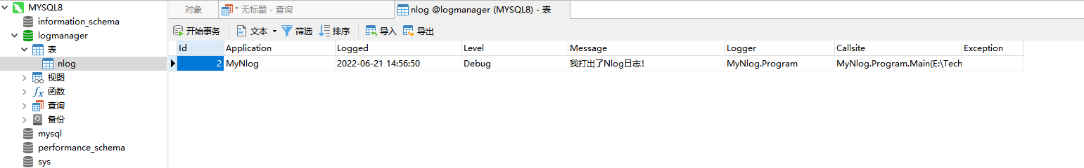 <?xml version="1.0" encoding="utf-8" ?> <nlog xmlns="http://www.nlog-project.org/schemas/NLog.xsd" xmlns:xsi="http://www.w3.org/2001/XMLSchema-instance" autoReload="true" throwExceptions="true" internalLogLevel="Off"> <targets> <!--输出到数据库--> <target name="d" xsi:type="Database" dbProvider="MySql.Data.MySqlClient.MySqlConnection, MySql.Data" connectionString="server=服务器IP地址;Database=logmanager;user id=root;password=123456;SslMode=none"> <commandText> insert into nlog ( Application, Logged, Level, Message, Logger, CallSite, Exception ) values ( @Application, @Logged, @Level, @Message, @Logger, @Callsite, @Exception ); </commandText> <parameter name="@application" layout="MyNlog" /> <parameter name="@logged" layout="${date}" /> <parameter name="@level" layout="${level}" /> <parameter name="@message" layout="${message}" /> <parameter name="@logger" layout="${logger}" /> <parameter name="@callSite" layout="${callsite:filename=true}" /> <parameter name="@exception" layout="${exception:tostring}" /> </target> </targets> <rules> <logger name="*" minlevel="Debug" writeTo="d" /> </rules> </nlog>