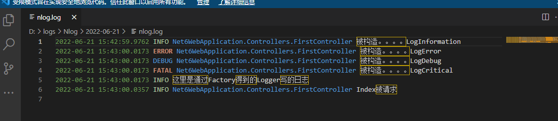 public class FirstController : Controller { private readonly ILogger<FirstController> _ILogger; private readonly ILoggerFactory _ILoggerFactory; public FirstController(ILogger<FirstController> logger, ILoggerFactory iLoggerFactory) { this._ILogger = logger; _ILogger.LogInformation($"{this.GetType().FullName} 被构造。。。。LogInformation"); _ILogger.LogError($"{this.GetType().FullName} 被构造。。。。LogError"); _ILogger.LogDebug($"{this.GetType().FullName} 被构造。。。。LogDebug"); _ILogger.LogTrace($"{this.GetType().FullName} 被构造。。。。LogTrace"); _ILogger.LogCritical($"{this.GetType().FullName} 被构造。。。。LogCritical"); this._ILoggerFactory = iLoggerFactory; ILogger<FirstController> _ILogger2 = _ILoggerFactory.CreateLogger<FirstController>(); _ILogger2.LogInformation("这里是通过Factory得到的Logger写的日志"); } public IActionResult Index() { _ILogger.LogInformation($"{this.GetType().FullName} Index被请求"); return View(); } }