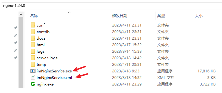 将前边准备好的xml文件及下载的WinSW程序拷贝到需要配置开机自启的程序文件夹,根据需求重命名这两个文件,注意保持两个文件名一致。