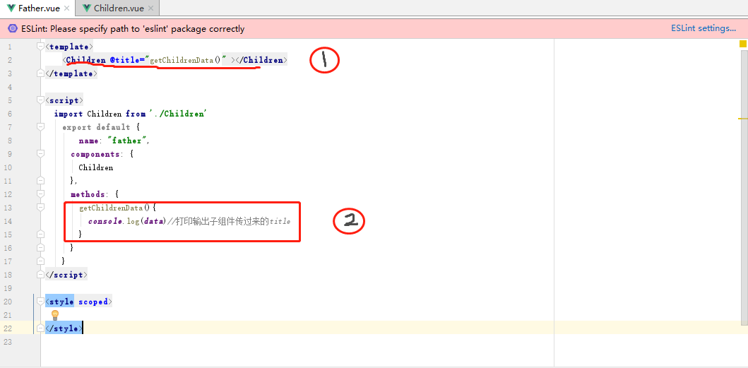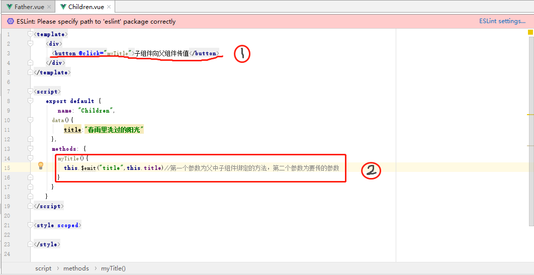 1).引入子组件【具体请看1】 2).第二步子组件创建一个按钮,给按钮绑定一个点击事件,用于传值 3).子组件在在响应该点击事件的函数中使用$emit来触发一个自定义事 件,并传递参数,4).在父中的子组件中监听该自定义事件并添加一个响应该事件的处理方法 5).在父中的处理方法中获得子组件传的数据