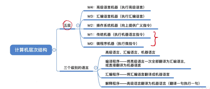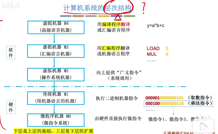 从硬件到软件部分:微指令系统(由硬件直接执行微指令)-->用机器语言的机器(执行二进制指令)-->--软件--》操作系统机器(向上提供广义指令)-->虚拟机器(汇编语言机器)-->虚拟机器(高级语言程序)