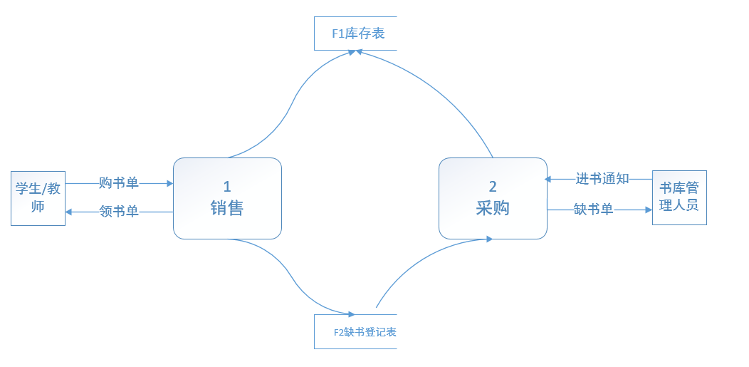 销售系统的主要工作过程为:首先由教师或学生提交购书单,经教材发行人员审核是有效购书单后,开发票、登记并返给教师或学生领书单,教师或学生可以到书库领书。