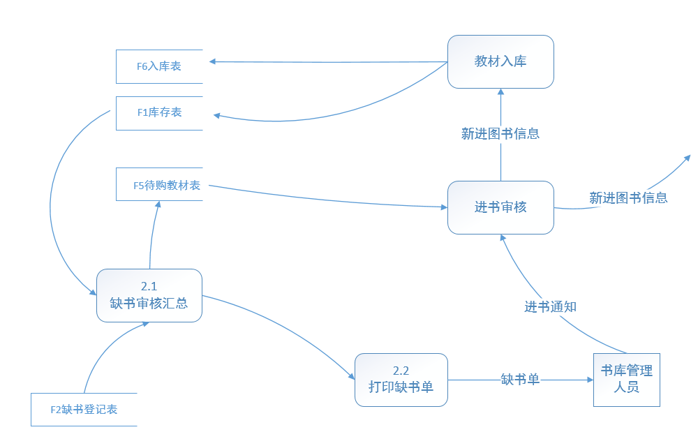 采购系统的主要工作过程为:若是脱销教材,则登记缺书,发缺书单给书库采购人员;一旦新书入库后,即发进书单通知给教材发