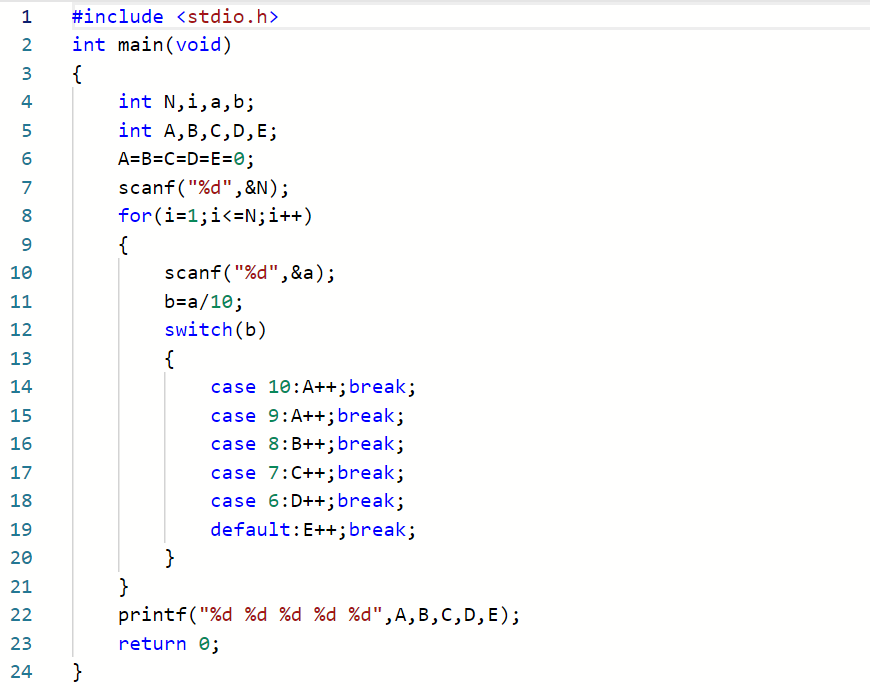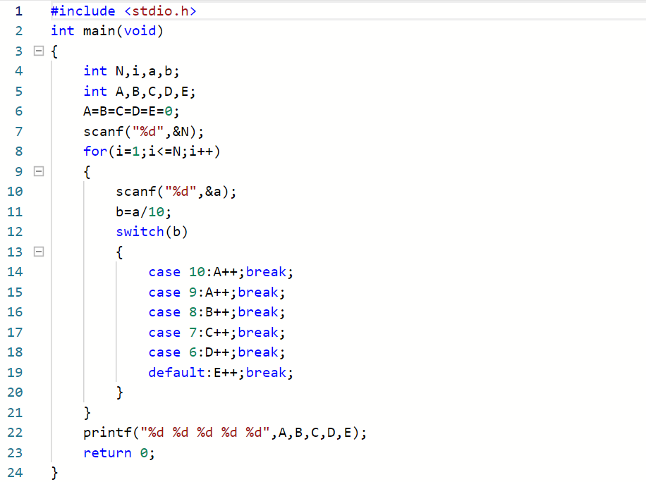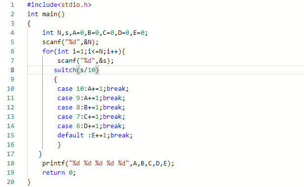 1.2本题要求编写程序读入N个学生的百分制成绩,统计五分制成绩的分布。百分制成绩到五分制成绩的转换规则:大于等于90分为A;小于90且大于等于80为B;小于80且大于等于70为C;小于70且大于等于60为D;小于60为E。