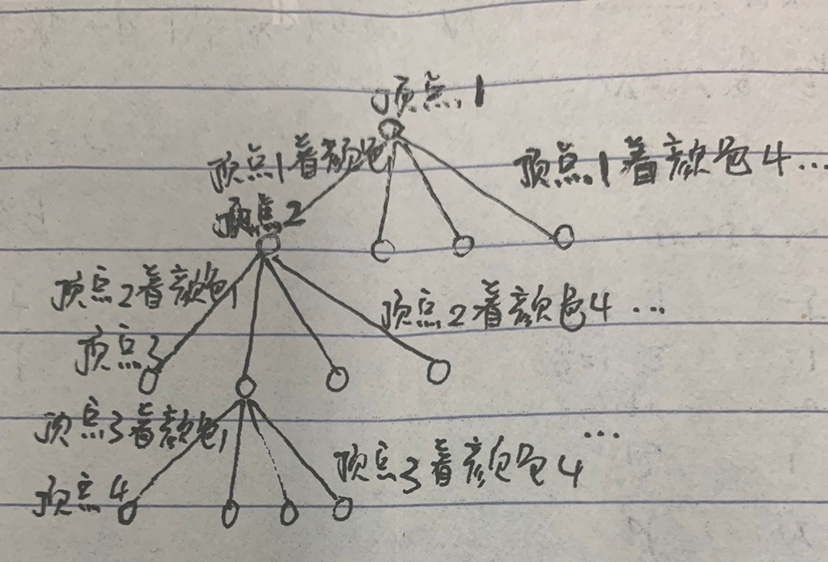 设G有n个顶点,将顶点编号为1,2,……,n,则搜索空间为深度n的m叉完全树,将颜色编号为1,2,…,m结点<x1,x2,…x3,xk>(x1,x2,…,xk∈{1,…,m},1<=k<=n)表示顶点1的颜色x1,顶点2的颜色x2,…,顶点k的颜色xk。