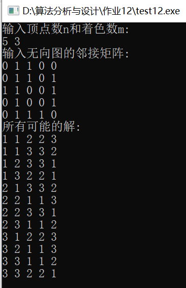 给定无向连通图G和m种颜色,用这些颜色给图的顶点着色,每个顶点一种颜色。如果要求G的每条边的两个顶点着不同颜色。给出所有可能的着色方案;如果不存在,则回答“NO”。