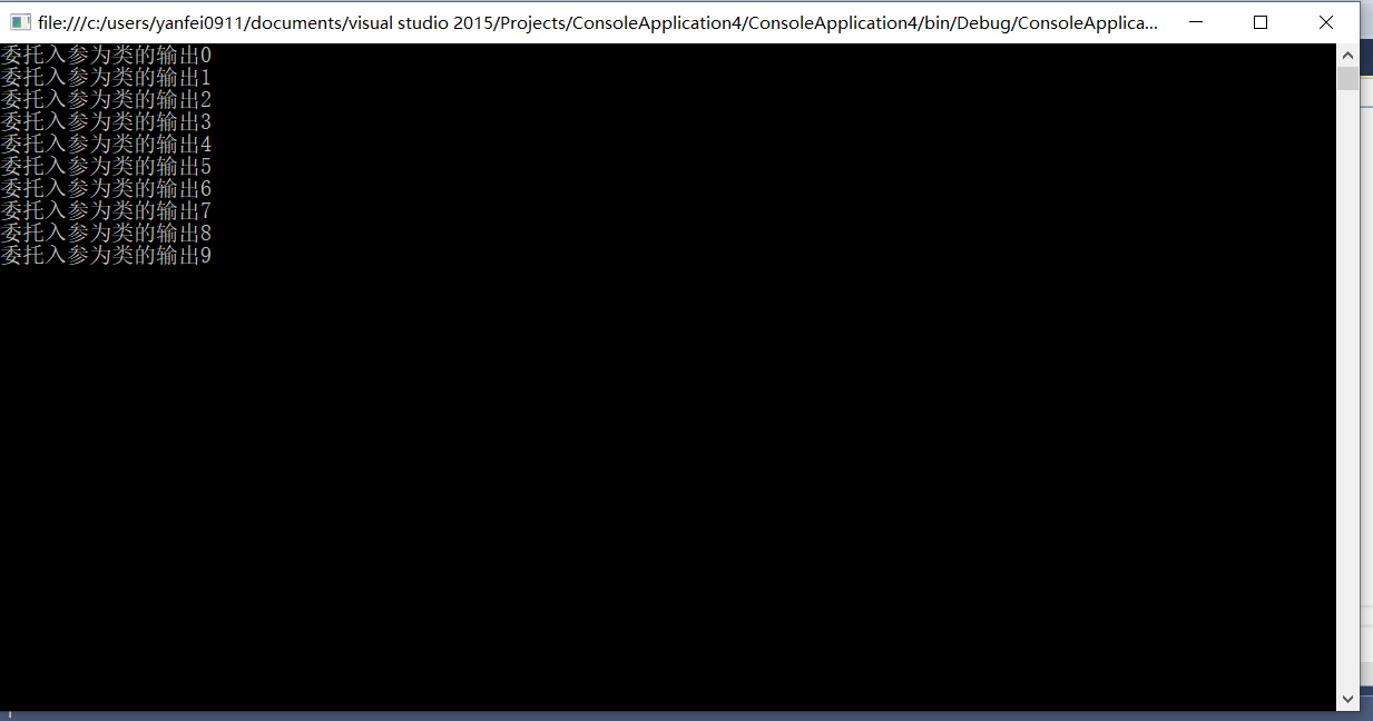 static void Main(string[] args) { //调用方法的类 AscClass c = new AscClass(); //入参为类的委托,目录是传入更新题目的字符串 Action<UpdateClassAction> action = ui => { for (int i = 0; i < 10; i++) { ui.UpdateTitle.Invoke("委托入参为类的输出"+i); } }; //调用 c.AnsyWorker(action); Console.Read(); }