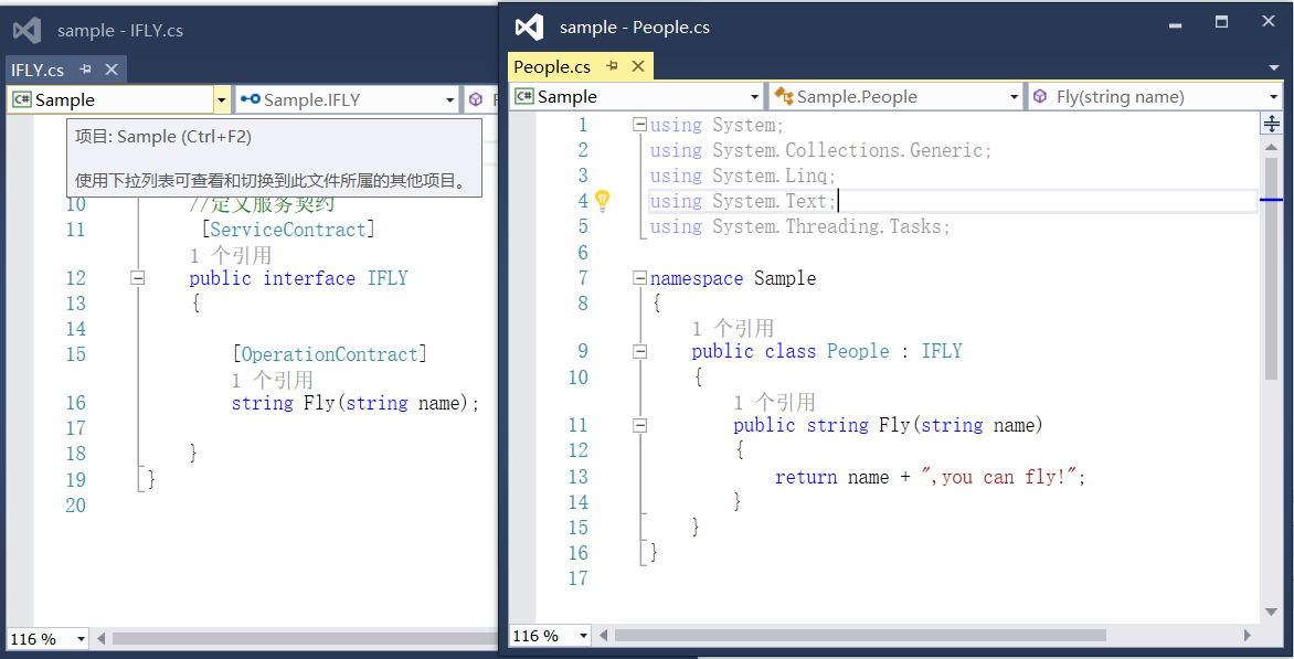 第三:"C"是契约,就是告诉别人我wcf这里有哪些东西。