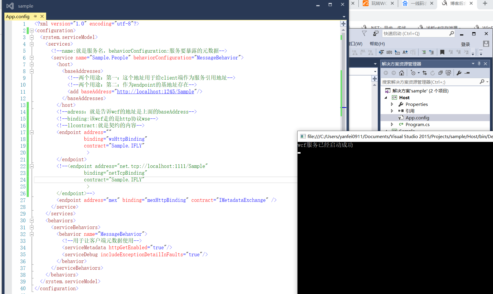 第二步:现在服务处于预开启状态,为了让wcf更加灵活,更加容易控制,就要将相关的配置写入到config里面,