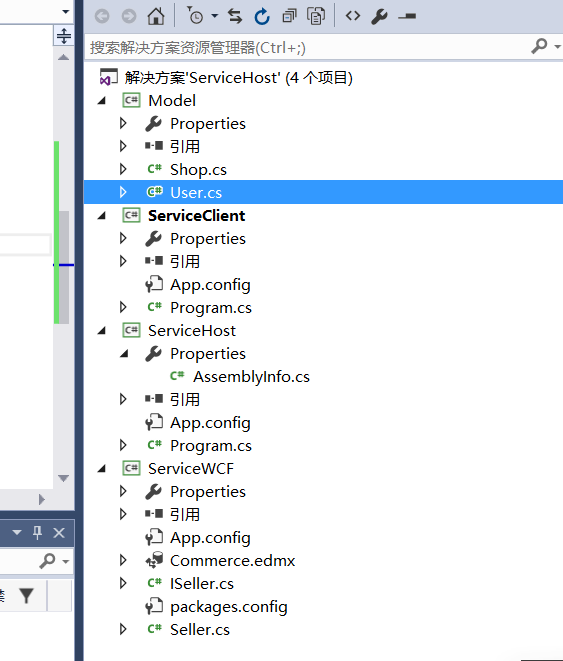 第三步:新建一个Model类库。建立两个实体类Shop和User,当然自定义类型在WCF中传输,