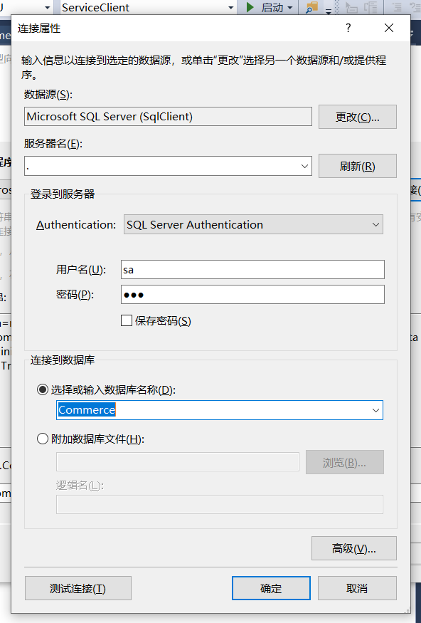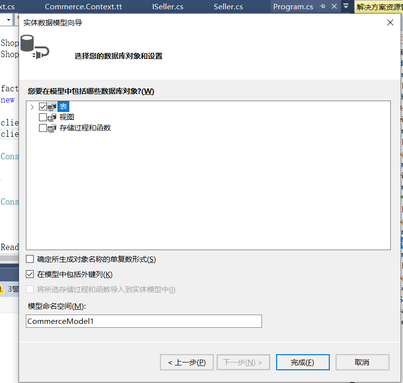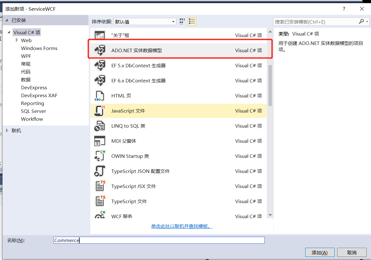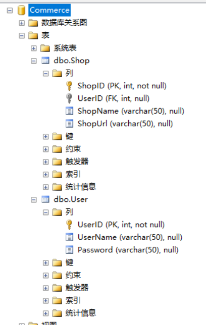 第二步:准备工作,我们新建Commerce数据库,创建User,Shop表,然后新建ServiceWCF类,用EF去映射,添加一个Commerce实体,具体步骤