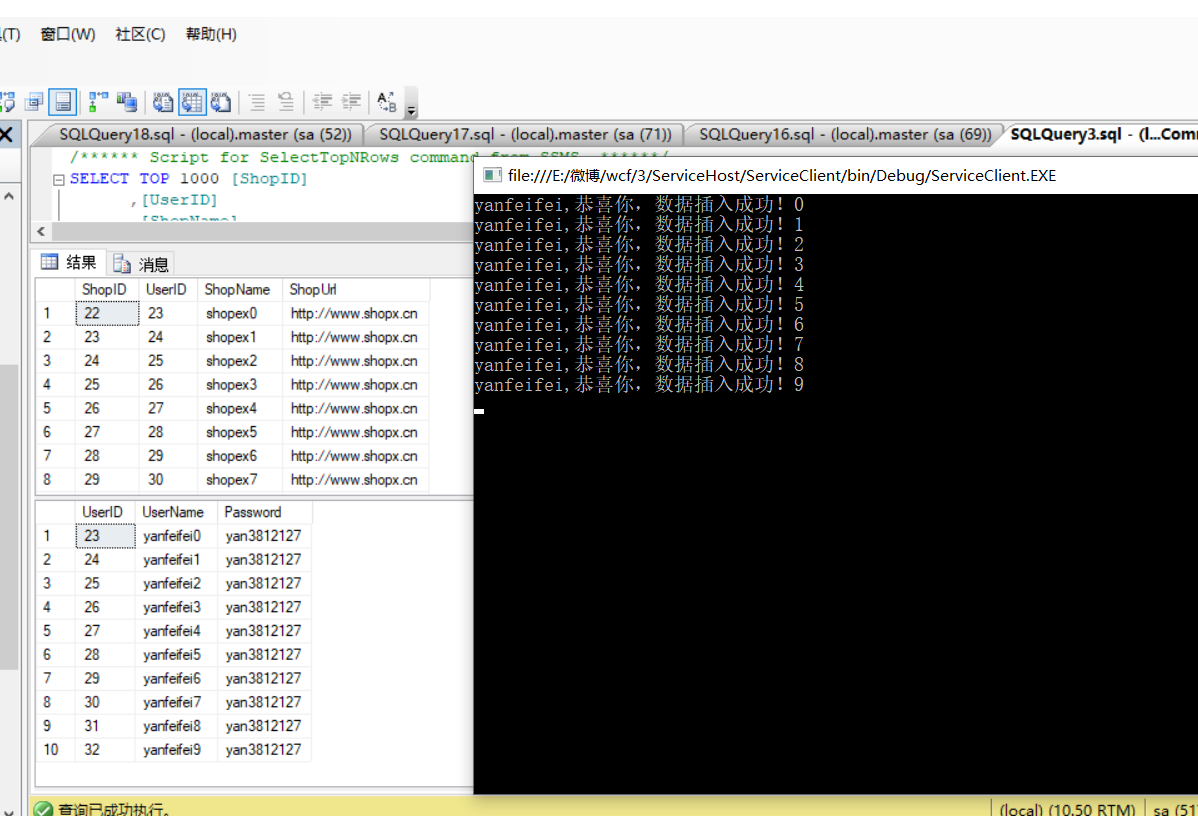 using ServiceWCF; using System; using System.Collections.Generic; using System.Linq; using System.ServiceModel; using System.Text; using System.Threading.Tasks; namespace ServiceClient { class Program { static void Main(string[] args) { for (int i = 0; i < 10; i++) { var user = new Model.User() { UserName = "yanfeifei"+i, Password = "yan3812127" }; var shop = new Model.Shop() { ShopName = "shopex"+i, ShopUrl = "http://www.shopx.cn" }; var factory = new ChannelFactory<ISeller>(new WSHttpBinding(), new EndpointAddress("http://localhost:8732/Seller/")); var client = factory.CreateChannel(); if (client.Add(user, shop)) { Console.WriteLine("yanfeifei,恭喜你,数据插入成功!"+i); } else { Console.WriteLine("yanfeifei,呜呜,数据插入失败!"); } } Console.Read(); } } }