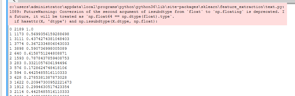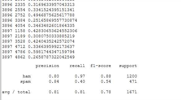 #1.数据准备:收集数据与读取 file_path = r'C:\Users\Administrator\Desktop\data.txt' EmailData = open(file_path,'r',encoding='utf-8') Email_data = [] Email_target = [] csv_reader = csv.reader(EmailData,delimiter='\t') #2. 数据预处理:处理数据 for line in csv_reader: # 将数据分别存入数据列表和目标分类列表 Email_data.append(line[1]) Email_target.append(line[0]) EmailData.close() # 把无意义的符号都替换成空格 Email_data_clear = [] for line in Email_data: # line :'Go until jurong point, crazy.. Available only in bugis n great world la e buffet...' # 每一行都去掉无意义符号并按空格分词 for char in line: if char.isalpha() is False: # 不是字母,发生替换操作: newString = line.replace(char," ") tempList = newString.split(" ") # 将处理好后的一行数据追加到存放干净数据的列表 Email_data_clear.append(tempList) # 去掉长度不大于3的词和没有语义的词 Email_data_clear2 = [] for line in Email_data_clear: tempList = [] for word in line: if word != '' and len(word) > 3 and word.isalpha(): tempList.append(word) tempString = ' '.join(tempList) Email_data_clear2.append(tempString) Email_data_clear = Email_data_clear2 #3. 训练集与测试集:将先验数据按一定比例进行拆分,分为训练集和测试集 from sklearn.model_selection import train_test_split x_train,x_test,y_train,y_test = train_test_split(Email_data_clear2,Email_target,test_size=0.3,random_state=0,stratify=Email_target) # 建立数据的特征向量 from sklearn.feature_extraction.text import TfidfVectorizer tfidf = TfidfVectorizer() X_train = tfidf.fit_transform(x_train) X_test = tfidf.transform(x_test) # 观察向量 import numpy as np X_train = X_train.toarray() X_test = X_test.toarray() X_train.shape # 输出不为0的列 for i in range(X_train.shape[0]): for j in range(X_train.shape[1]): if X_train[i][j] != 0: print(i,j,X_train[i][j]) # 建立模型 from sklearn.naive_bayes import GaussianNB gnb = GaussianNB() module = gnb.fit(X_train,y_train) y_predict = module.predict(X_test) # 输出模型分类的各个指标 from sklearn.metrics import classification_report cr = classification_report(y_predict,y_test) print(cr)