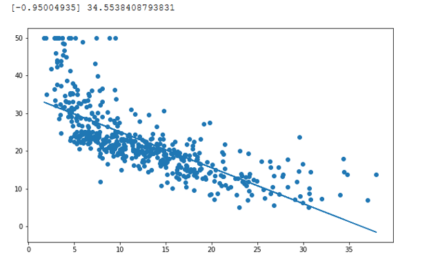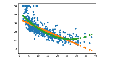 #1.导入boston房价数据集 from sklearn.datasets import load_boston boston = load_boston() boston.keys() import pandas as pd df = pd.DataFrame(boston.data) #将数据data转化为数据框 #2. 一元线性回归模型,建立一个变量与房价之间的预测模型,并图形化显示。 import matplotlib.pyplot as plt x = boston.data[:,5] y = boston.target #房价 plt.figure(figsize=(8,6)) plt.scatter(x,y) plt.plot(x,9.1*x-34,'r') plt.show() #3. 多元线性回归模型,建立13个变量与房价之间的预测模型,并检测模型好坏,并图形化显示检查结果。 from sklearn.linear_model import LinearRegression lineR = LinearRegression() lineR.fit(boston.data,y) w = lineR.coef_ #斜率 b = lineR.intercept_ #截距 print(w) print(b) #4. 一元多项式回归模型,建立一个变量与房价之间的预测模型,并图形化显示。 import matplotlib.pyplot as plt x = boston.data[:,12].reshape(-1,1) y = boston.target plt.figure(figsize=(10,6)) plt.scatter(x,y) from sklearn.linear_model import LinearRegression lineR = LinearRegression() lineR.fit(x,y) y_pred = lineR.predict(x) plt.plot(x,y_pred) print(lineR.coef_,lineR.intercept_) plt.show() from sklearn.preprocessing import PolynomialFeatures poly = PolynomialFeatures(degree=2) x_poly = poly.fit_transform(x) lrp = LinearRegression() lrp.fit(x_poly,y) y_poly_pred = lrp.predict(x_poly) plt.scatter(x,y) plt.scatter(x,y_pred) plt.scatter(x,y_poly_pred) plt.show()