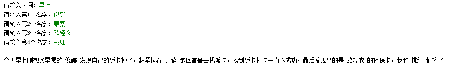 T=input('请输入时间:') n1=input('请输入第1个名字:') n2=input('请输入第2个名字:') n3=input('请输入第3个名字:') n4=input('请输入第4个名字:') print('\n今天{}刚想买早餐的 {} 发现自己的饭卡掉了,赶紧拉着 {} 跑回宿舍去找饭卡,' '找到饭卡打卡一直不成功,最后发现拿的是 {} 的社保卡,我和 {} 都笑了\n\n'.format(T,n1,n2,n3,n4))