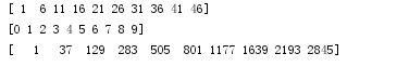 import numpy #用numpy函数创建num1,num2,mul num1 = numpy.arange(1,50,5) num2 = numpy.arange(10) mul = num1**2 + num2**3 print(num1) print(num2) print(mul)