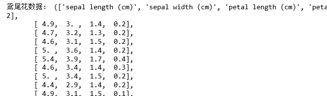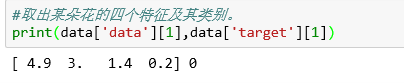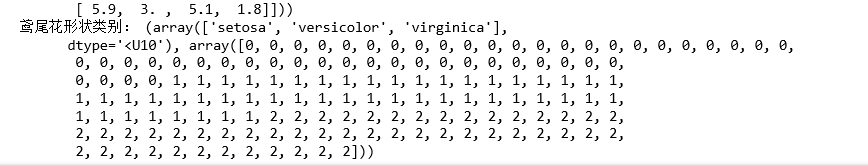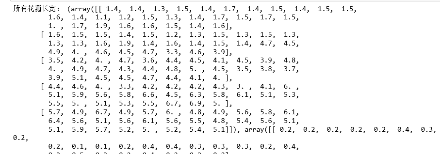import numpy from sklearn.datasets import load_iris #从sklearn包自带的数据集中读出鸢尾花数据集data data=load_iris() print(data) print(type(data))#查看data类型 data.keys()#包含哪些数据 #取出鸢尾花特征和鸢尾花类别数据,查看其形状及数据类型 iris_feature=data['feature_names'],data['data'] iris_target=data.target_names,data.target print('鸢尾花数据:',iris_feature) print('鸢尾花形状类别:',iris_target) sepal_len = numpy.array(list(len[0] for len in data['data'])) print('所有花萼长度:',sepal_len) #取出所有花的花瓣长度(cm)+花瓣宽度(cm)的数据 petal_len = numpy.array(list(len[2] for len in data['data'])) petal_len.resize(5,30) #重新分配花瓣长度petal_len的内存 petal_wid = numpy.array(list(len[3] for len in data['data'])) petal_wid.resize(5,30) #重新分配花瓣宽度petal_wid的内存 iris_lens = (petal_len,petal_wid) print('所有花瓣长宽:',iris_lens) #取出某朵花的四个特征及其类别。 print(data['data'][1],data['target'][1]) #将所有花的特征和类别分成三组,每组50个 iris_set = [] #0表示山鸢尾花 iris_ver = [] #1表示杂色鸢尾花 iris_vir = [] #3表示维吉尼亚鸢尾花 for i in range(0,150): #for循环遍历所有的数据 if data['target'][i] == 0: # 类别为0的为setosa花,生成一条setosa类的鸢尾花数据 db = data['data'][i].tolist() db.append('setosa') iris_set.append(db) elif data['target'][i]==1: # 类别为1的即为versicolor,生成一条versicolor类的鸢尾花数据 db = data['data'][i].tolist() db.append('versicolor') iris_ver.append(db) else: #剩下类别为virginica鸢尾花数据 db = data['data'][i].tolist() db.append('virginica') iris_vir.append(db) # 9.生成新的数组,每个元素包含四个特征+类别 iris_result = numpy.array([iris_set, iris_ver, iris_vir]) print("分组:", iris_result)