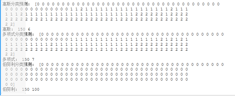 from sklearn.datasets import load_iris; iris = load_iris() #高斯分布式算法 from sklearn.naive_bayes import GaussianNB gnb = GaussianNB() #建立模型 pred = gnb.fit(iris.data,iris.target) #模型分类 G_pred = pred.predict(iris.data) #分类预测 print("高斯分类预测:",G_pred) print("高斯:",iris.data.shape[0],(iris.target != G_pred).sum()) #多项式分布算法 from sklearn.naive_bayes import MultinomialNB mal = MultinomialNB() pred = mal.fit(iris.data,iris.target) M_pred = pred.predict(iris.data) print("多项式分类预测:",M_pred) print("多项式:",iris.data.shape[0],(iris.target != M_pred).sum()) #伯努利分布算法 from sklearn.naive_bayes import BernoulliNB bl = BernoulliNB() pred = bl.fit(iris.data,iris.target) B_pred = pred.predict(iris.data) print("伯努利分类预测:",B_pred) print("伯努利:",iris.data.shape[0],(iris.target != B_pred).sum())