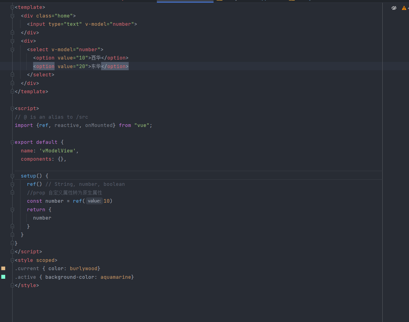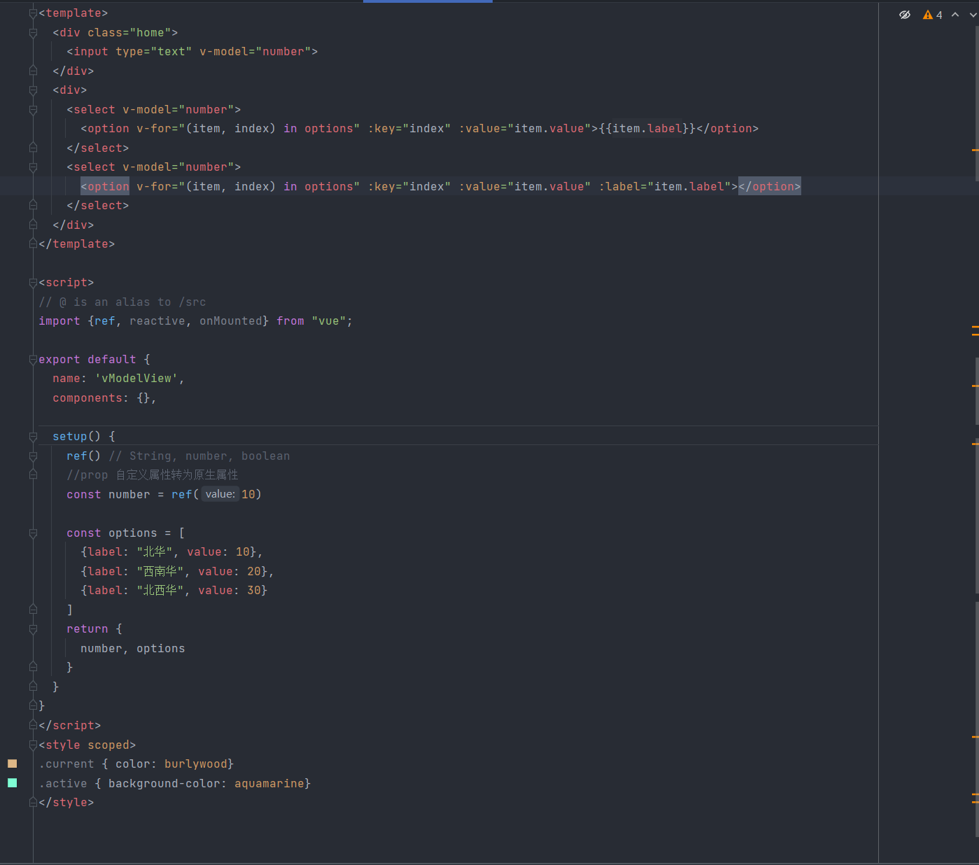 可以看到输入框和选择框的值是相互对应的,在select元素的中,绑定的v-model的number值为多少就对应着value值为多少,在option元素中,如果有对应的value值就显示