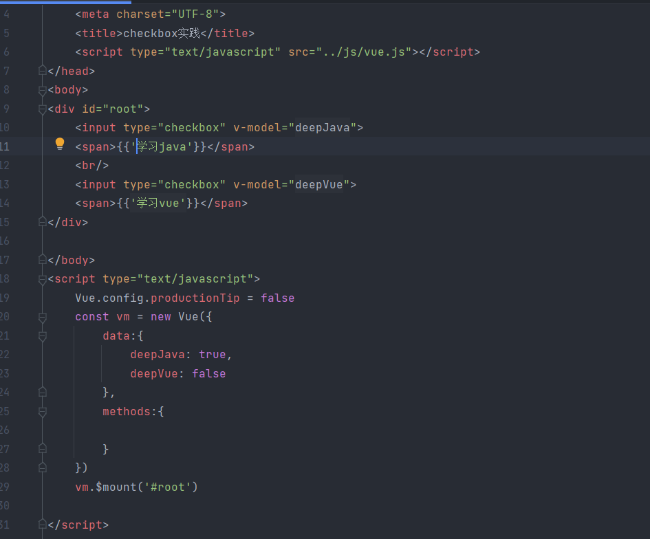 如果input输入框的type为checkbox,并且使用了v-model,且v-model绑定的值为布尔值,则可以根据布尔值来判断够不勾选