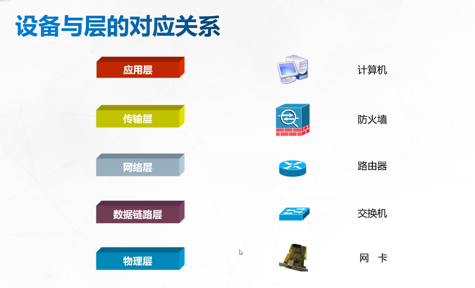 | 物理层 | 建立、维护、断开物理连接 | 比特流 | 网卡 |
