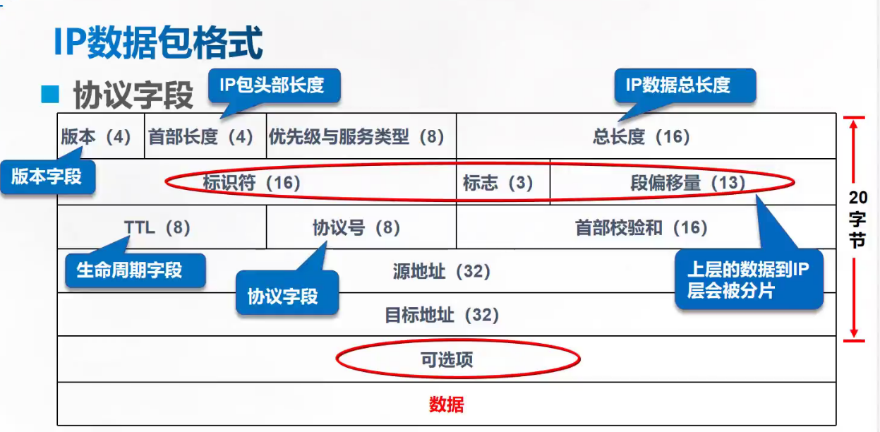 IP数据包格式(分为20字节的固定部分,表示每个ip数据包必须包含的部分,和40字节的可变长部分)
