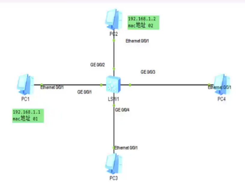 5.pc2 会回复自己的mac 地址给交换机,形成mac 地址表6.下次就以单播的形式,进行通讯