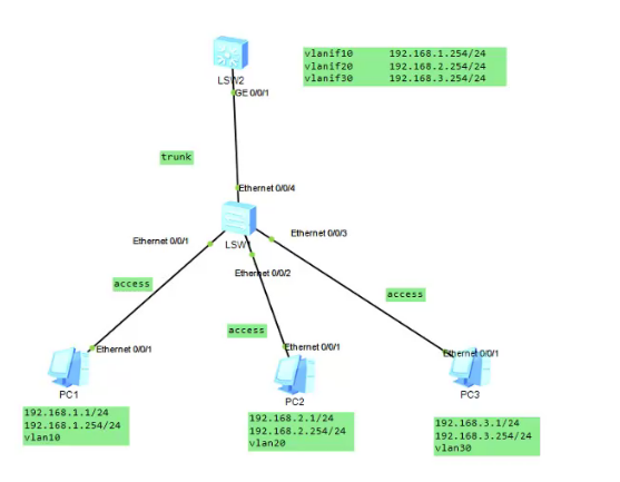 [sw1-GigabitEthernet0/0/3]port default vlan 30 #只允许带有vlan 30标签的流量通过