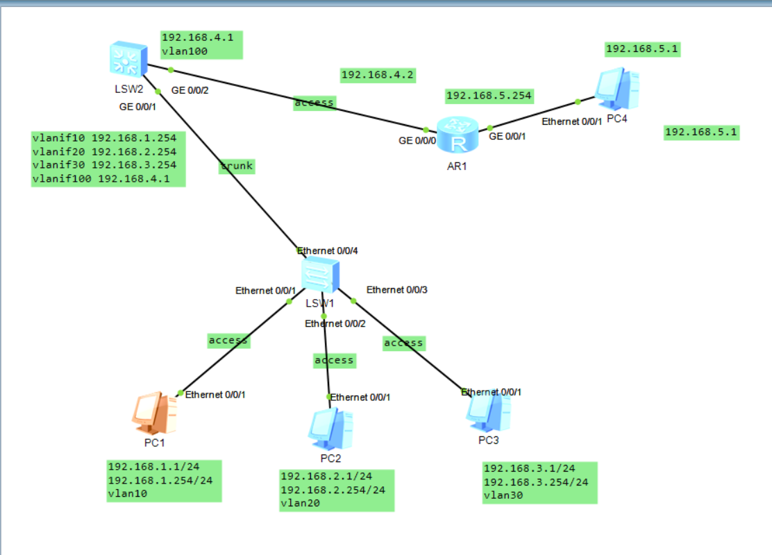 [sw1-GigabitEthernet0/0/4]port link-type trunk #设置接口为trunk类型