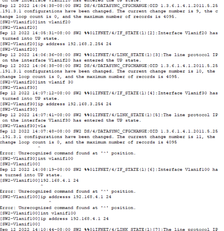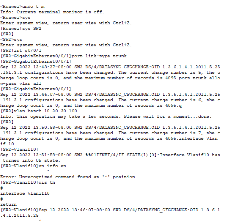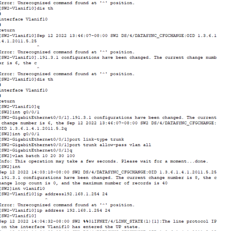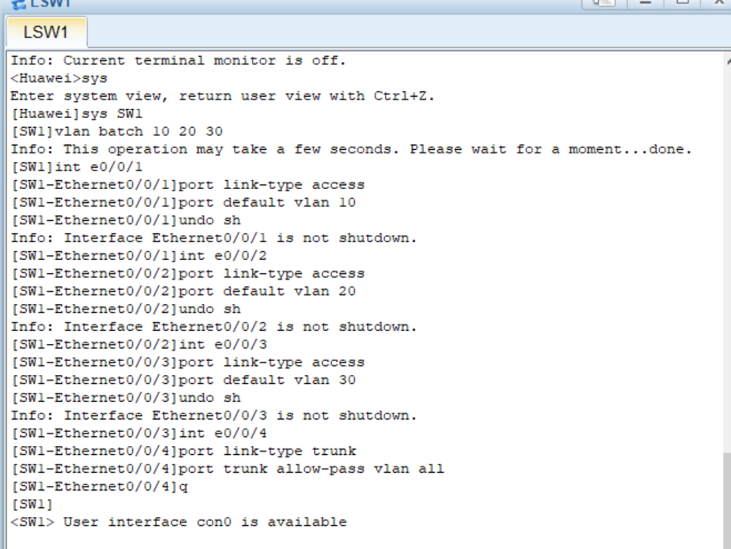 [sw1]vlan batch 10 20 #创建VLAN 10 20