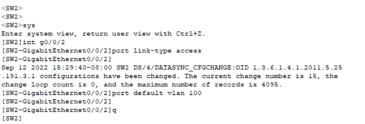 [sw1-GigabitEthernet0/0/2]port link-type access #设置接口为access类型