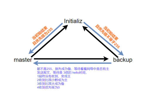 Initialize设备启动时进入此状态,当收到接口Startup的消息,将转入Backup或Master状态(IP地址拥有者的接口优先级为255,直接转为Master)。在此状态时,不会对VRRP报文做任何处理。