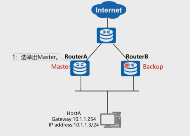 (1) 虚拟路由器中的路由器根据优先级选举出Master。Master路由器通过发送免费ARP报文,将自己的虚拟MAC地址通知给与它连接的设备或者主机,从而承担报文转发任务;