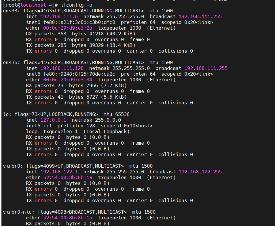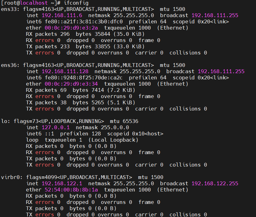 在不带任何选项和参数执行 ifconfig 命令时, 将显示当前主机中已启用(活动)的网络接口信息
