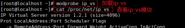 [root@localhost ~]# modprobe ip_vs [root@localhost ~]# cat /proc/net/ip_vs IP Virtual Server version 1.2.1 (size=4096) Prot LocalAddress:Port Scheduler Flags -> RemoteAddress:Port Forward Weight ActiveConn InActConn