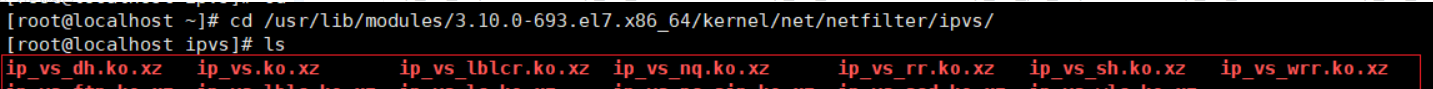 [root@localhost ~]# cd /usr/lib/modules/3.10.0-693.el7.x86_64/kernel/net/netfilter/ipvs/ [root@localhost ipvs]# ls ip_vs_dh.ko.xz ip_vs.ko.xz ip_vs_lblcr.ko.xz ip_vs_nq.ko.xz ip_vs_rr.ko.xz ip_vs_sh.ko.xz ip_vs_wrr.ko.xz ip_vs_ftp.ko.xz ip_vs_lblc.ko.xz ip_vs_lc.ko.xz ip_vs_pe_sip.ko.xz ip_vs_sed.ko.xz ip_vs_wlc.ko.xz