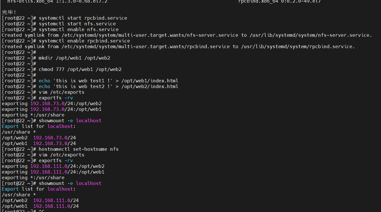 [root@localhost nfs]# systemctl start rpcbind [root@localhost nfs]# systemctl start nfs [root@localhost nfs]# showmount -e Export list for localhost.localdomain: /opt/nginx/qyd 192.168.111.0/24 /opt/nginx/my 192.168.111.0/24