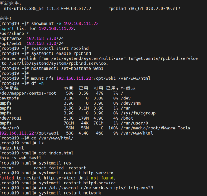 [root@localhost ~]#mount 192.168.111.22:/opt/nfs/my /var/www/html/ [root@localhost ~]# df -h 文件系统 容量 已用 可用 已用% 挂载点 /dev/mapper/centos-root 20G 3.7G 17G 19% / devtmpfs 473M 0 473M 0% /dev tmpfs 489M 0 489M 0% /dev/shm tmpfs 489M 7.2M 481M 2% /run tmpfs 489M 0 489M 0% /sys/fs/cgroup /dev/sda1 1014M 161M 854M 16% /boot tmpfs 98M 0 98M 0% /run/user/0 tmpfs 98M 12K 98M 1% /run/user/42 192.168.52.110:/opt/nfs/my 10G 3.7G 6.4G 37% /var/www/html [root@localhost ~]# cd /var/www/html/ [root@localhost html]# ls index.html [root@localhost html]# cat index.html this is my