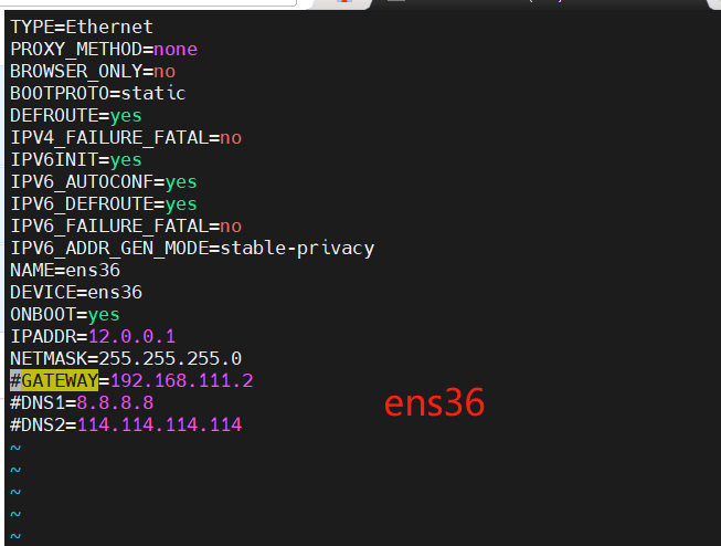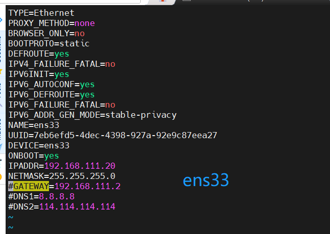 [root@localhost network-scripts]# vim /etc/sysctl.conf -------------------------------------------------------- net.ipv4.ip_forward = 1 [root@localhost network-scripts]# sysctl -p net.ipv4.ip_forward = 1