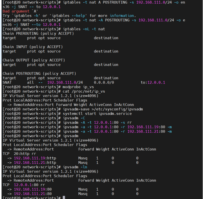 [root@localhost network-scripts]# ipvsadm -A -t 12.0.0.1:80 -s rr -A添加虚拟服务器 -t VIP,虚拟IP所用外网网卡 -s算法 rr 轮询算法 #先指定虚拟服务器再添加真实服务器地址, [root@localhost network-scripts]# ipvsadm -a -t 12.0.0.1:80 -r 192.168.111.19:80 -m -a 真实服务器 -t:VIP -r:真实IP地址(节点服务器地址) -m:使用nat模式 [root@localhost network-scripts]# ipvsadm -a -t 12.0.0.1:80 -r 192.168.111.21:80 -m