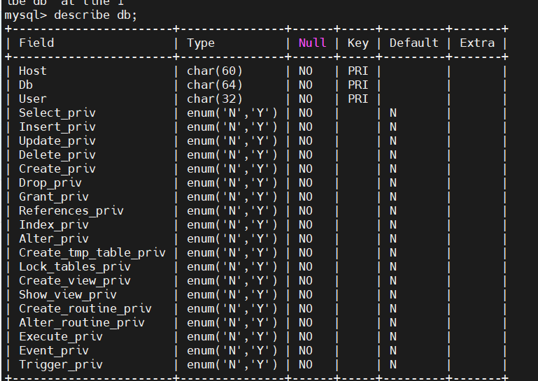 fire :字段名称 Type:数据类型 Null:是否为空 Key:主键 Default:默认值 Extra:扩展属性
