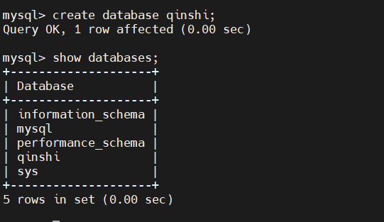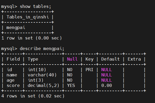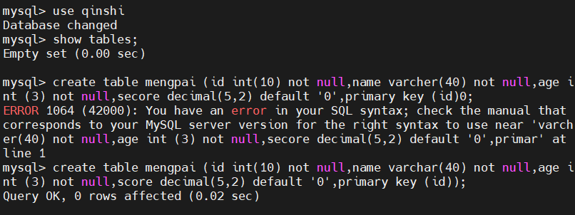 create database qinshi; #创建一个名为qinshi的数据库 create table mengpai(id int(10) not null,name varchar(40) not null,age int (3) not null,score decimal(5,2) default '0',primary key (id)); #创建一个名为memgpai,(定义id不为空,名字不为空,年龄不为空,成绩可为空默认为“0”,主键为id) create table scholl.renwu (id int(10) not null); # 在任意库中创建school库中的renwu表
